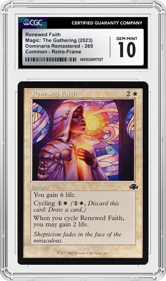 Renewed Faith has three different artwork variants, all from different artists. The first set to include the card was 2002’s Onslaught, which featured artwork by Dave Dorman, and the second set was 2017’s Amonkhet, which featured an illustration by Wesley Burt. Steve Argyle’s artwork was featured in Masters 25, which was released a year later in 2018. Unlike Dorman and Burt’s full-art scenes, Argyle focused his artwork on a close-up of a cleric, praying within a cathedral.