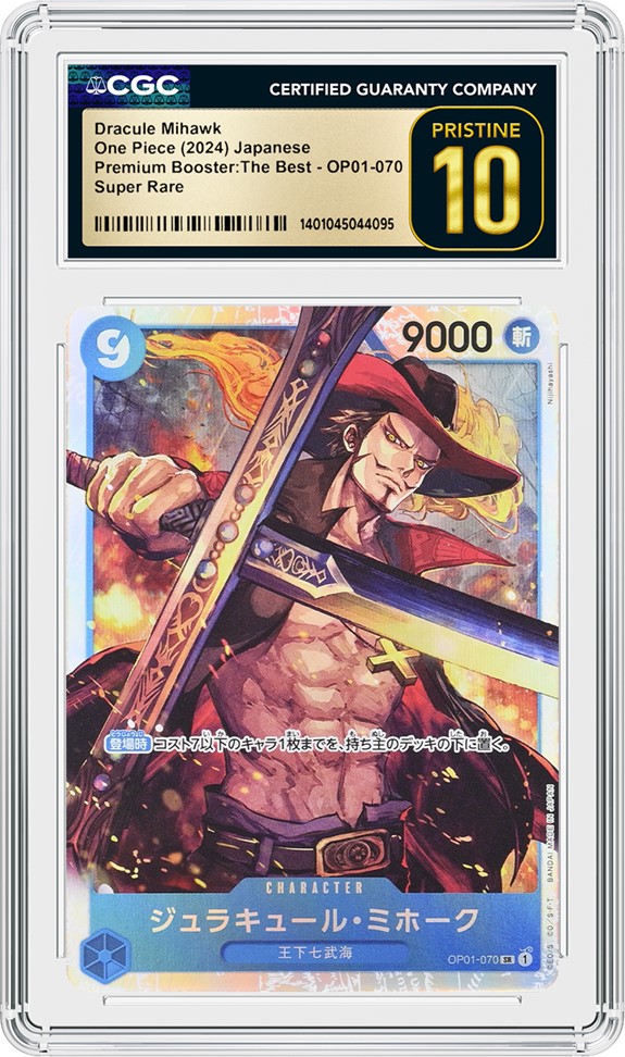 Dracule Mihawk is one of the greatest swordsmen in the One Piece universe, and Zoro’s main rival. He and Zoro were also the main focus of one of the most recent One Piece Card game sets: Legacy of the Master. This card was reprinted from Romance Dawn and the Zoro and Sanji Starter Deck. The close-up artwork of Mihawk and his signature weaponry is gorgeous, leading many collectors and players to send their copies into CGC for authentication and grading.