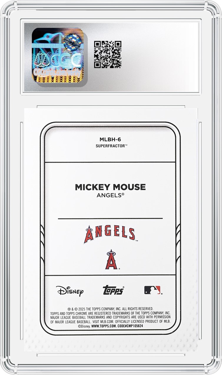 Arguably the biggest hit in the whole set was recently certified by CGC®, and the one-of-one gem from the Disney x MLB collab is currently being offered in Heritage's Non-Sports Trading Cards Showcase Extended Bidding Auction #43218, which ends on November 13, 2025. The sought-after 2025 Topps Disney Chrome #MLBH-6 Mickey Mouse (Los Angeles Angels) MLB Home Jersey - SuperFractor graded CGC Gem Mint 10 (lot 73001) has already seen bidding in the hundreds of dollars, with more than two weeks left in the sale.