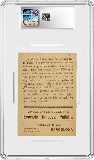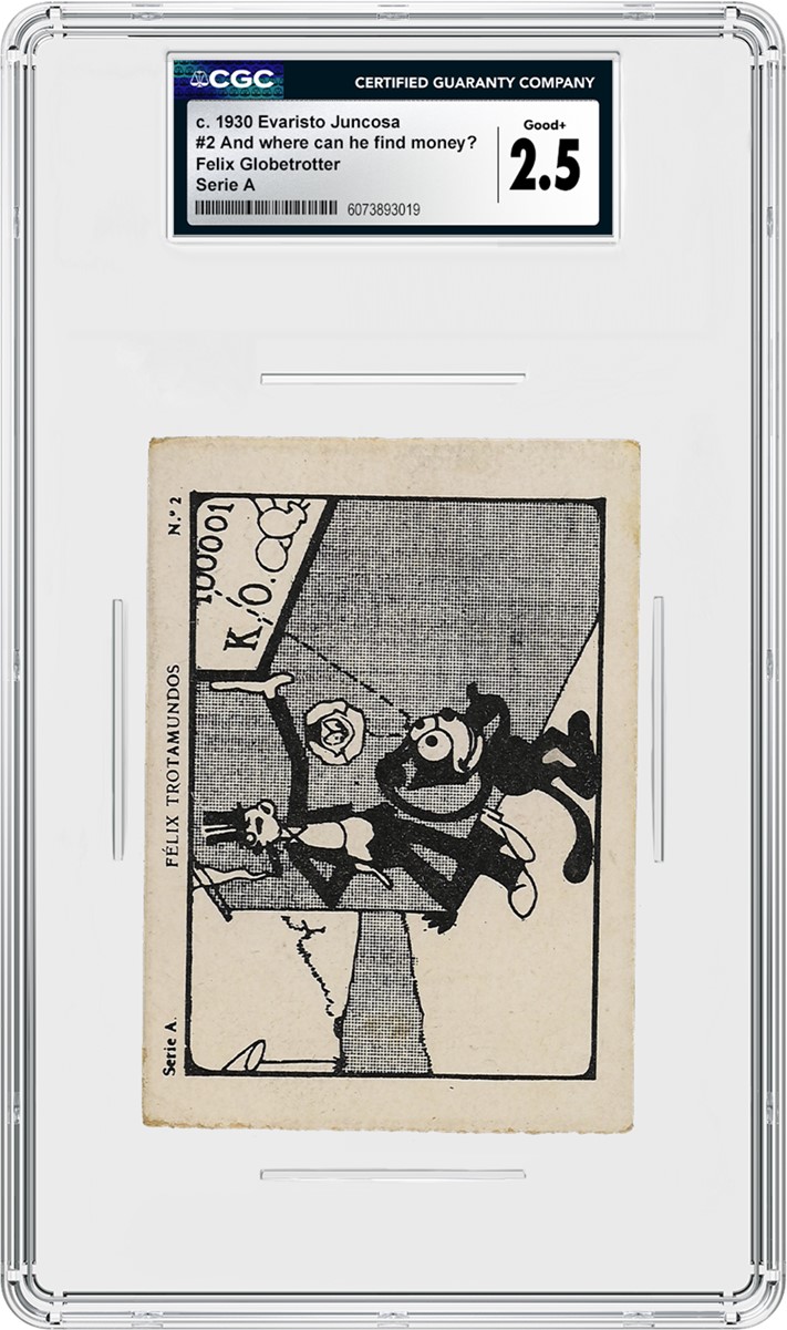 A second set of 15 cards from Evaristo Juncosa — this one featuring Felix the Cat — is also being offered in the Hake’s sale. The Spanish c. 1930 Evaristo Juncosa Felix Globetrotter Series A cards are similar to Mickey’s set, with Felix’s 15-card set based on a 1923 short revolving around a boxing kangaroo. The fronts of the cards feature black-and-white illustrations from the short cartoon, while the backs offer text describing the scene and Evaristo Juncosa’s “Chocolates Selectos” company imprint. Each card is graded CGC 1.5 through CGC 4.5.