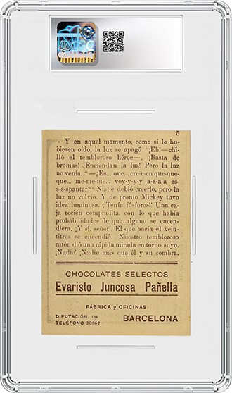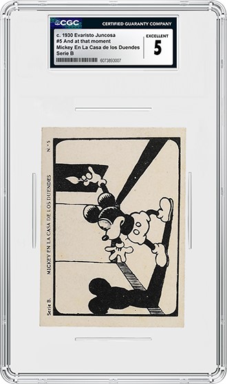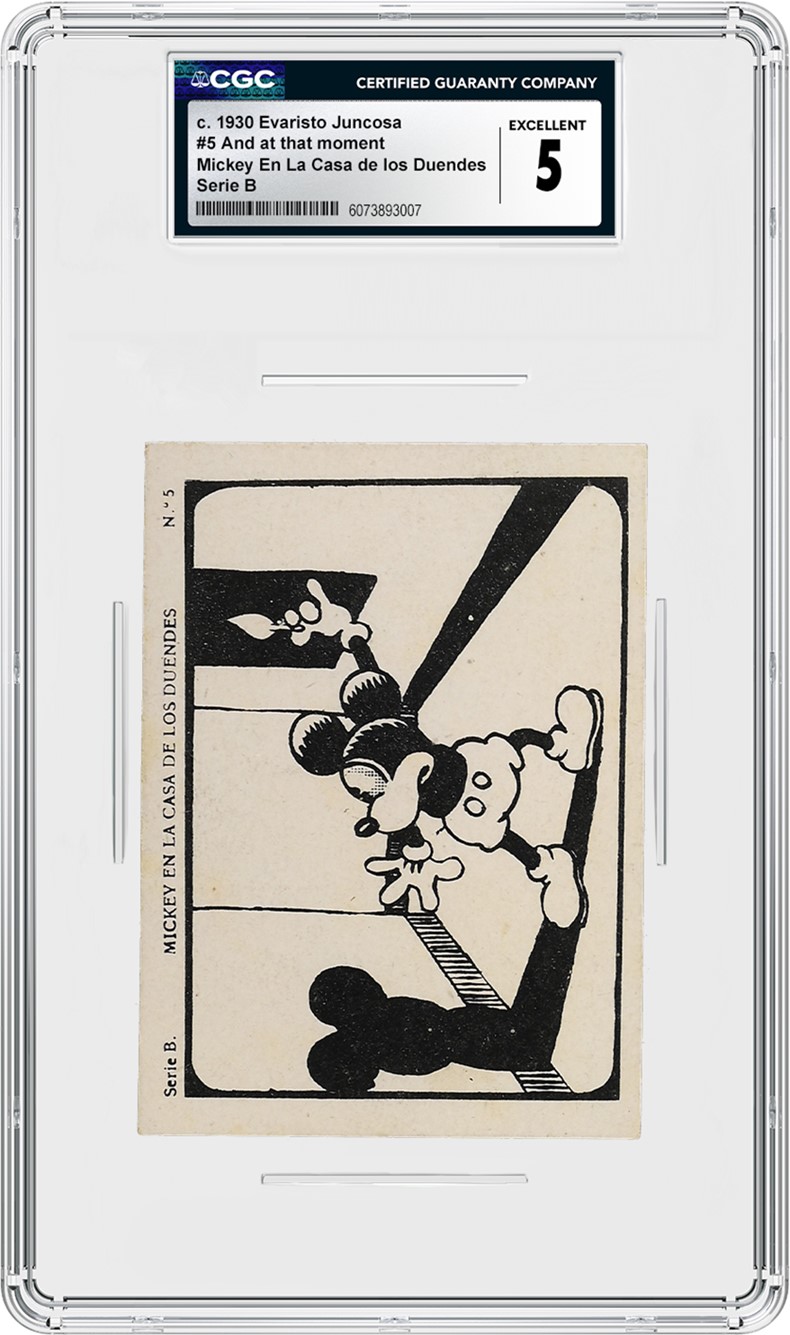 A complete set of 15 Spanish c. 1930 Evaristo Juncosa, Mickey En La Casa de los Duendes Series B cards is the top highlight in the sale. Issued in Barcelona, these early cards depict stills of Mickey in “The Haunted House,” a short Disney cartoon — directed and voiced by Walt Disney himself — that first aired in late 1929. The 14th Mickey Mouse film, it was released a little more than a year after the November 1928 debut of the character in "Steamboat Willie." This set of cards was distributed by Evaristo Juncosa, a candy company based in Barcelona that partnered with various sports and cartoon companies to put gum and candy cards in their products. Each of the 15 cards in the set is certified by CGC and graded CGC 2.5 through CGC 5.