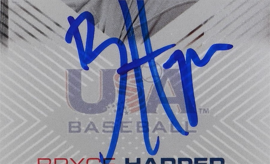 The 2009 Upper Deck USA Baseball Autographs #USA-83 Bryce Harper is from Harper's time with the Under-18 USA National Team and features one of his earliest signatures on a card. As for this particular purported example, when compared to an authentic version, red flags begin to show themselves everywhere across the card.