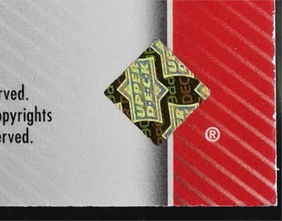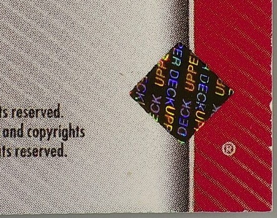 When shifting our attention to the back side of the card, we see more of the same around the Upper Deck holo sticker. The red border and white adjacent white line separating the border from the light gray background are muddied, showing ink bleeding that leads to a less defined area. Furthermore, the holo stickers clearly do not match and the registered trademark logo is extremely faded and hard to see.