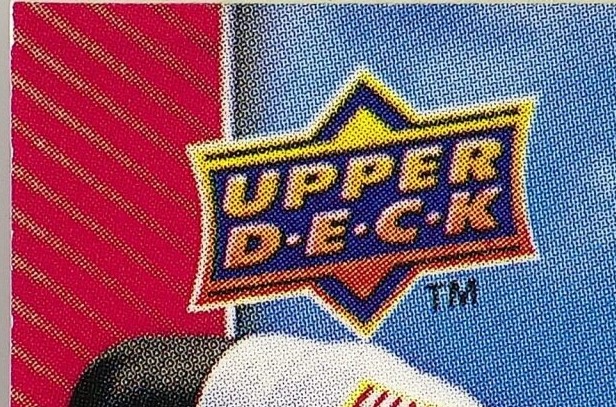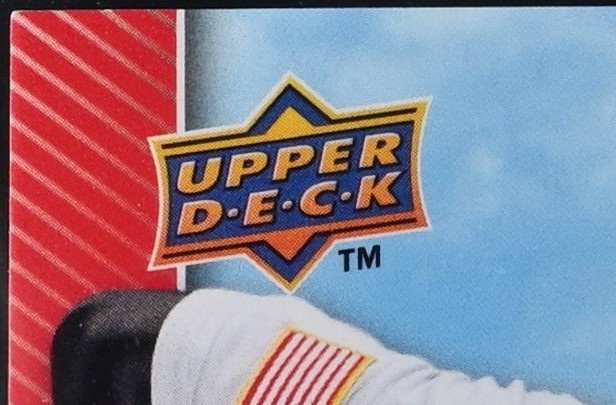Shifting over to the top left above his elbow is the classic Upper Deck logo, which is much fuzzier on the counterfeit example. Not only is the pixelation prominent but you can see that the borders of the logo are not as crisp and the colors are dull and not as vibrant due to a lower-quality print.