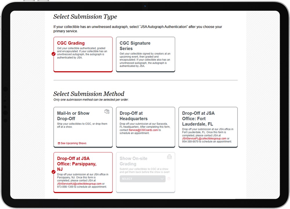 "JSA Office Drop-off" is available for all CGC grading tiers for cards, including CGC x JSA Authentic Autograph certification. Other CGC collectible types, such as comics and video games, are not able to be dropped off with JSA at this time. Appointments must be made for any drop-off submissions at JSA's New Jersey office, which is located at: