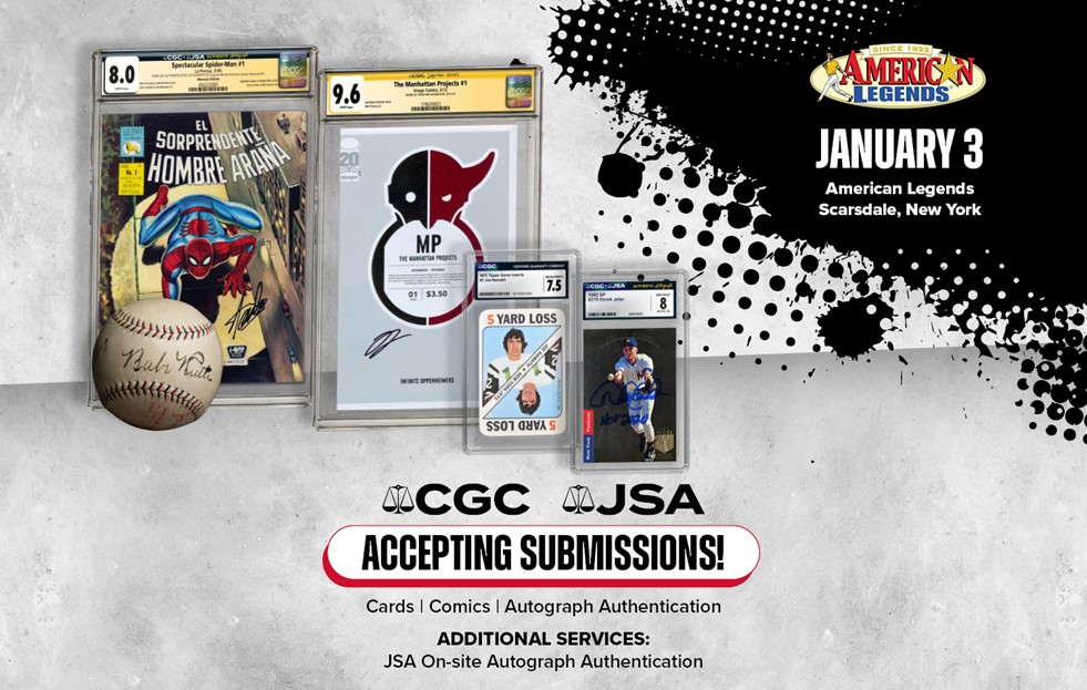 CGC® and JSA® are excited to be accepting submissions of cards, comics and autographed memorabilia at the American Legends sports collectible superstore in Scarsdale, New York, on January 3, 2026. In addition, JSA will be providing on-site autograph authentication for memorabilia during the January 3 event.