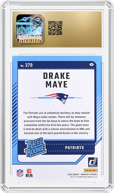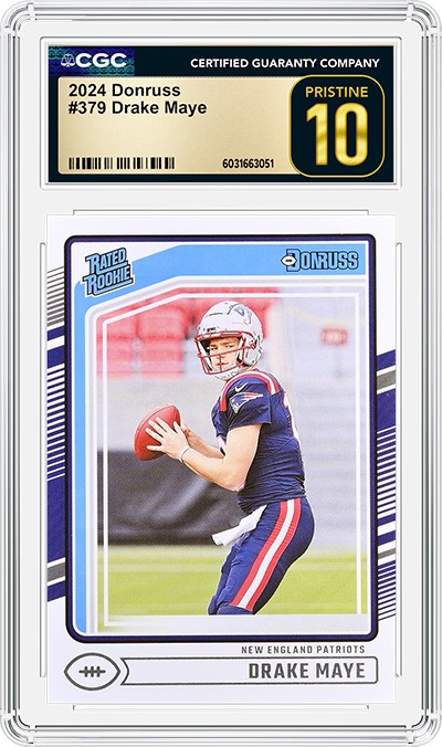 First, we had a New England Patriots legend and now we have the franchise's newest star: Drake Maye. Since Brady left New England after the 2019 season, the team has been on the hunt for their next franchise star under center. Enter the former North Carolina Tar Heel standout who has turned doubters into believers in his second pro season. Maye just led New England to a 14-3 regular season record and the team's first AFC East division title since Brady's exit. Meanwhile, as Maye gets his first taste of the NFL playoffs, CGC continues to see an influx of submissions that include his cards.