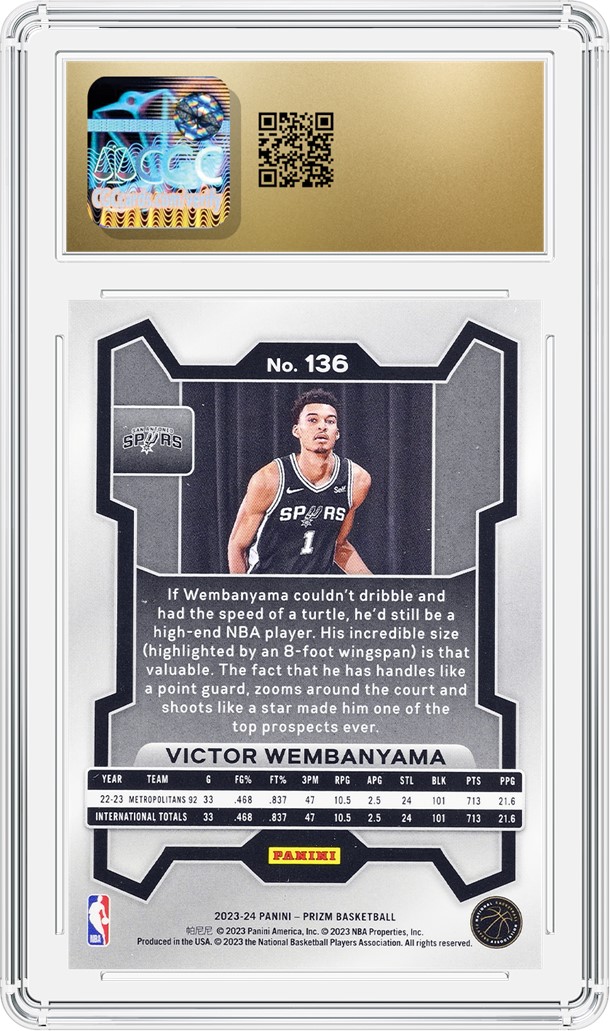 Arguably the most exciting young player to enter the league since LeBron James, 7'4" Frenchman Victor Wembanyama has been a game changer since he was selected by the San Antonio Spurs with the No. 1 overall pick in the 2023 NBA Draft. Although the big man has dealt with some injuries early on in his NBA career, when he is healthy there are few players who have an impact on both sides of the floor the way Wembanyama does. At only 22 years old, he is already among the NBA's elite, and in return, has become one of the most popular modern players to collect and submit.