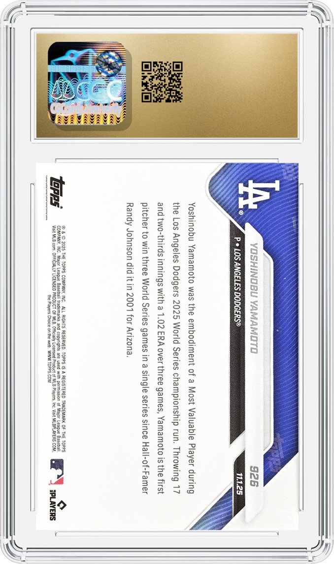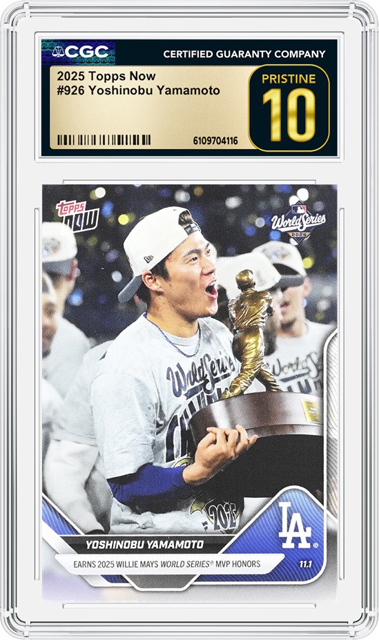 Yoshinobu Yamamoto joined the Los Angeles Dodgers ahead of the 2024 season after being one of the most successful modern pitchers ever in Japan. In two seasons in L.A., Yamamoto has become an All-Star, won two World Series titles and was named the 2025 World Series MVP for his unprecedented heroics. Yamamoto earned three wins, a 1.02 ERA and 15 strikeouts across Games 2, 6 and 7, becoming the first pitcher to ever earn three road wins in a single World Series. Fans and collectors alike have flocked to his collectibles since he joined the Dodgers, but after his 2025 postseason performances, CGC has seen a large uptick in Yamamoto submissions, including this Topps Now issue commemorating his historic World Series accomplishments.