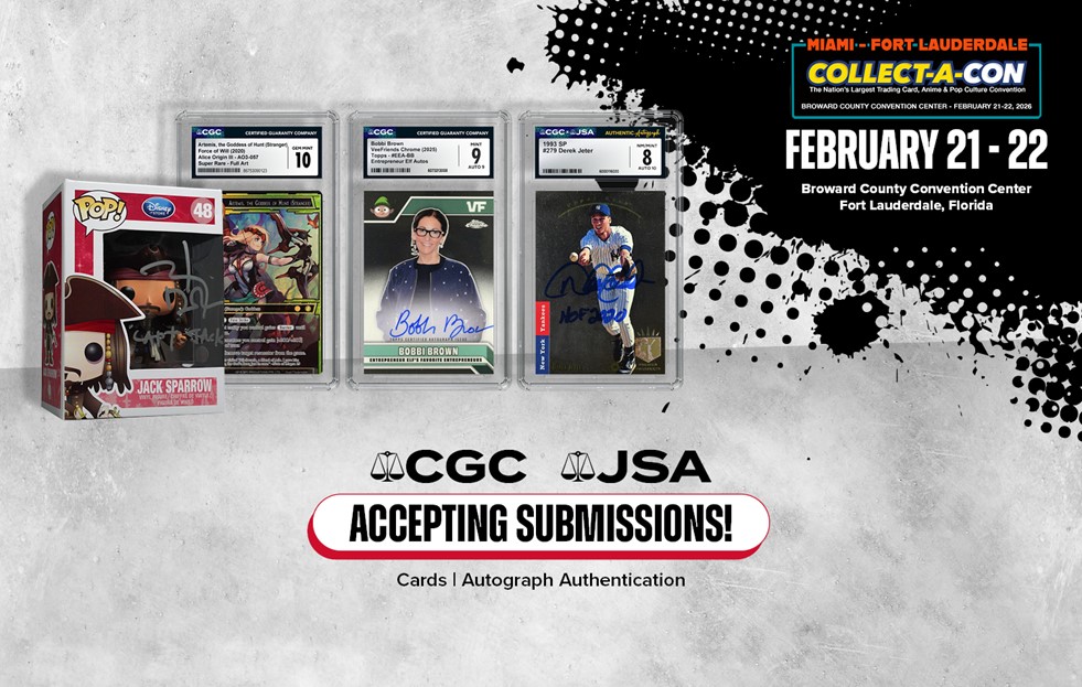 CGC® and JSA® are excited to be accepting submissions of cards and autographed memorabilia at Collect-A-Con Miami, being held at the Broward County Convention Center in Fort Lauderdale, Florida, on February 21-22, 2026.
