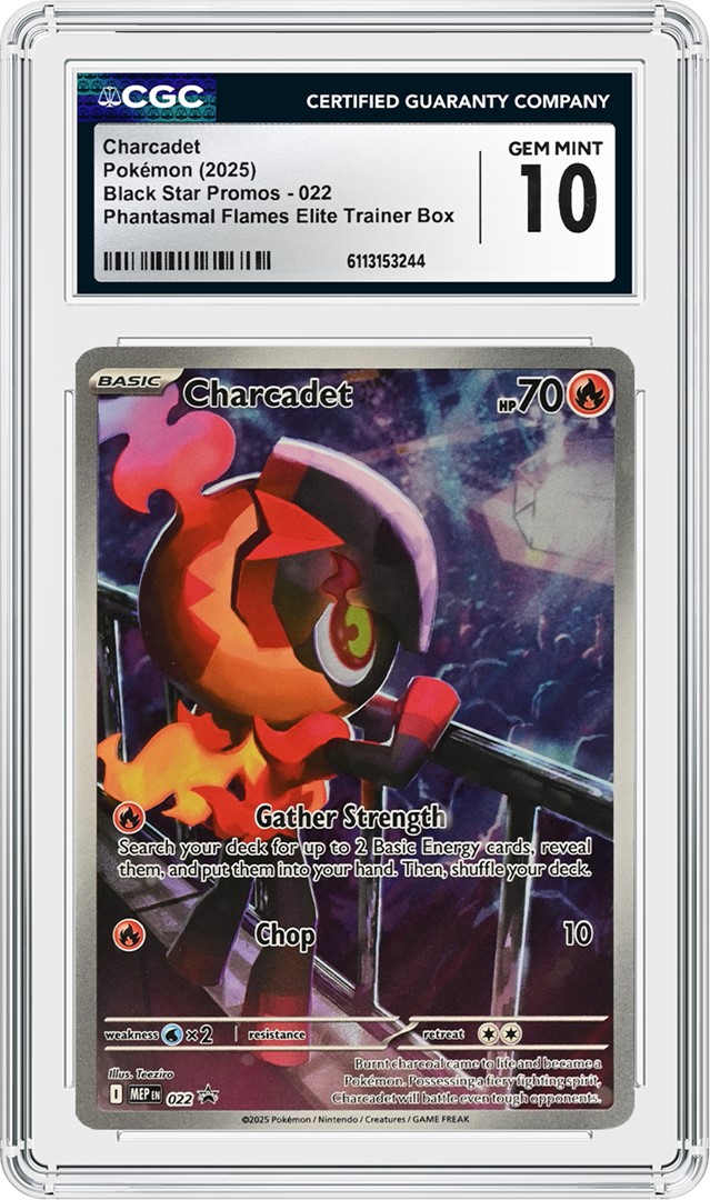 The Pokémon Company began including full-art Black Star Promos in Elite Trainer Box (ETB) products as a small bonus in the Scarlet and Violet era of the Pokémon TCG. Phantasmal Flame’s ETB came packaged with this alternate art Charcadet, excitedly watching an ongoing sports event. The card’s main ability, Gather Strength, also makes it desirable in decks because it allows players to farm two Basic Energy cards for the price of one. CGC has certified nearly a thousand examples of this Charcadet Black Star Promo, according to the CGC Cards Population Report.