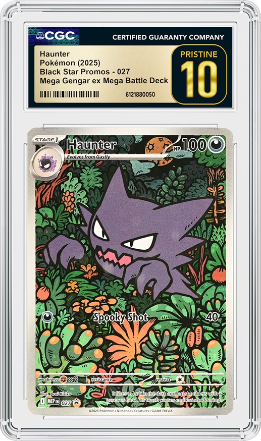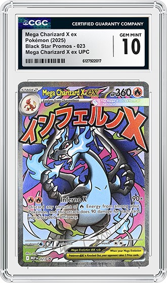 Mega Evolutions returned in Pokémon Legends: Z-A, which meant the return of everyone’s favorite mega-evolved fire-breathing lizard! Mega Charizard X shows off in all of its blue-and-black glory in this stunning full-art illustration, complete with the kanji attack text in the background. For collectors who didn’t pull the alternate art Mega Charizard X ex in Phantasmal Flames, this Black Star Promo is an excellent substitute for a binder or graded collection. Other collectors seem to think so, too, because CGC has already certified more than 13,000 examples of this Mega Charizard X ex promo card, according to the CGC Cards Population Report.