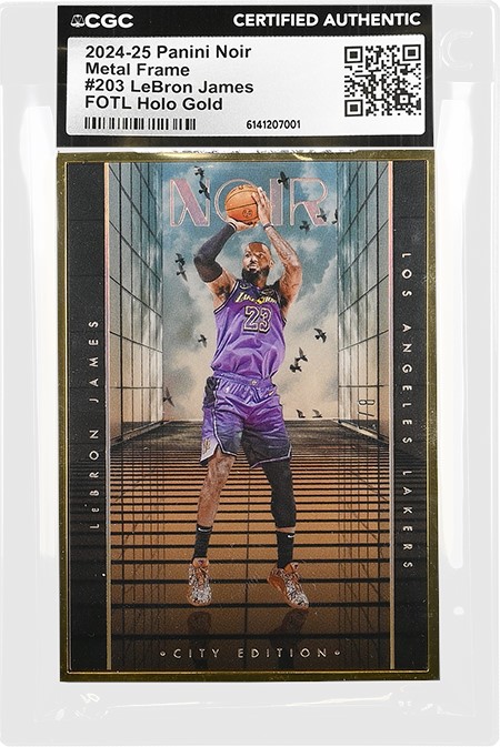 | An authentic 2024-25 Panini Noir Metal Frame #203 LeBron James - FOTL Holo Gold certified CGC Authentic Click images to enlarge. |