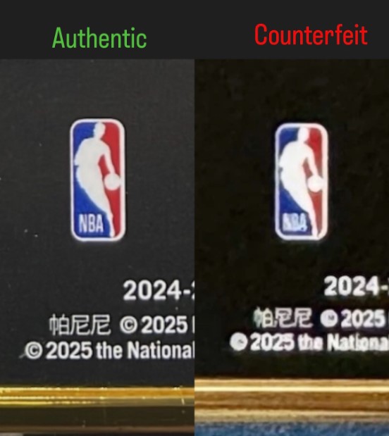 Zooming in on the logos on the back of the card reveals further discrepancies. For example, the details of the "NOIR 10 Years" logo are not as clean and don't line up as well on the counterfeit copy. It is clearly visible that the black and white sections of the "10" do not line up perfectly like they do on the authentic version. Also, the NBA logo looks muddied and the copyright text at the bottom of the card is extremely hazy, with no crisp letters or numbers to be seen.