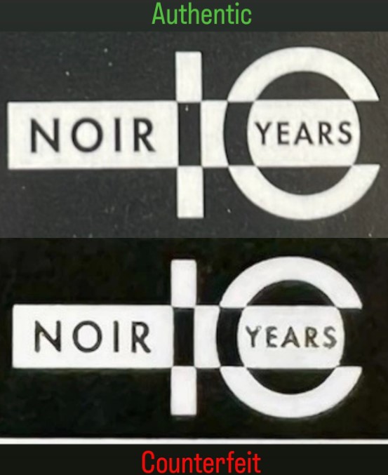 | TOP: Front closeup of the "NOIR" logo on the authentic card BOTTOM: Front closeup of the "NOIR" logo on the counterfeit card |