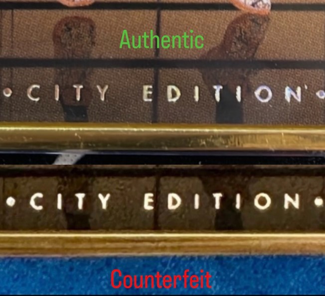 | TOP: Front closeup of "City Edition" on the authentic card BOTTOM: Front closeup of "City Edition" on the counterfeit card |