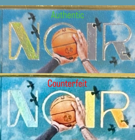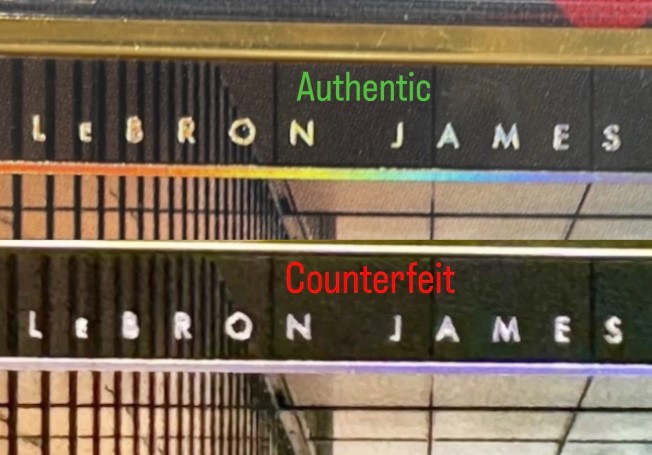 In addition, all text features foil lettering that pairs perfectly with the card's gold-colored metal frame on an authentic copy. When zooming in on the "NOIR" logo at the top, the "City Edition" at the bottom, James' name on the left and the team name on the right, the foil is not quite as sharp on the counterfeits.